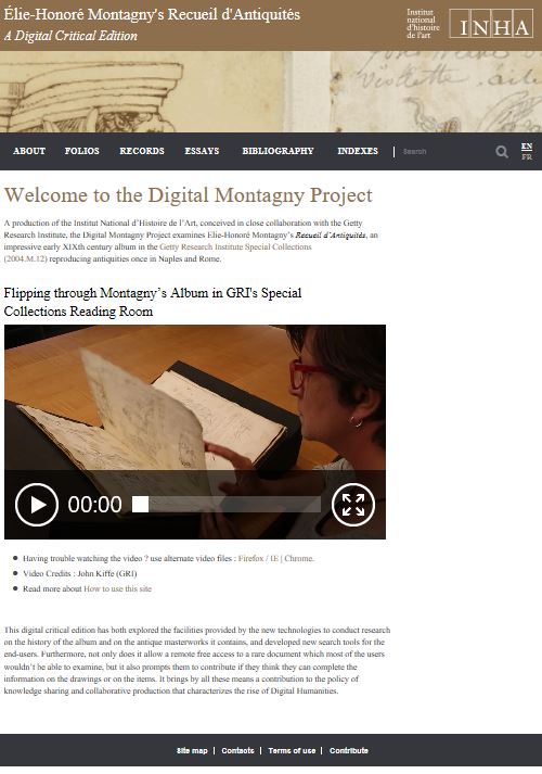 In a research and technical collaboration between Getty Research Institute (GRI) and Institut national d'histoire de l'art (INHA), the Digital Montagny sought to build on the lessons learned for the first digital critical facsimile edition published by the GRI. As visiting scholars to the GRI, Delphine Burlot and Martine Denoyelle were researching an unpublished album in the Research Institute's Special Collections by French artist Elie-Honoré Montagny entitled Recueil d'Antiquités (1804). The sketchbook contains drawings, tracings, and annotations by Montagny during his 1804–05 travels in southern Italy and Sicily. As the second manuscript to be collaboratively researched and edited online using the Getty Scholars' Workspace™ digital environment, the challenge here was to build a digital project that focused on images, as opposed to Digital Mellini's concentration on text. I served as project coordinator for the digital publication facilitated both research and technical work. Since we were not going to be hosting the website on Getty servers, the challenge of this project was coordinating the technical and research teams to create strong productive dialog between those at the GRI and those at INHA in order to make sure all the digital resources that were needed from The Getty Scholars’ Workspace™ environment were easily incorporated into the final digital publication hosted by INHA.