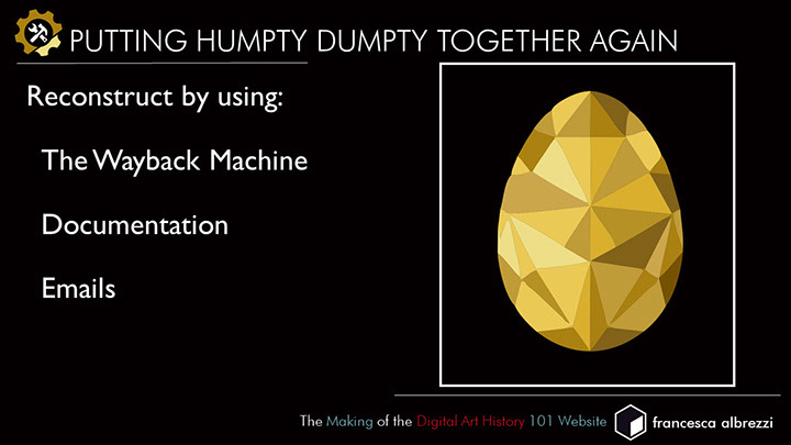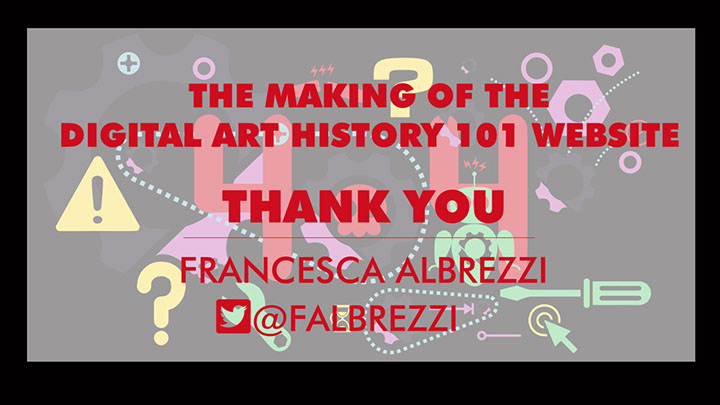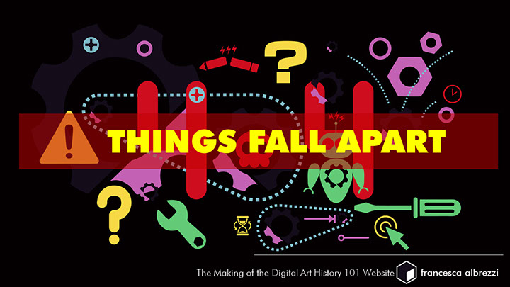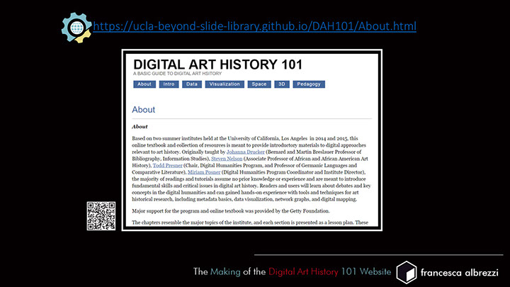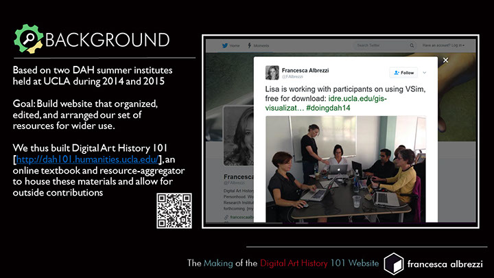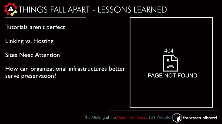 After gathering together specialized tutorials, lists of tools, and related projects and readings for this final online publication, I appreciate how critical it is to document a project and its communications efficiently and curate data carefully to support project goals and deliverables, whatever the content may be. Projects like USC’s Scalar gave me the idea to point to outside resources rather than host them independently. I had helped to build two Wordpress sites for the Beyond the Digitized Slide Library: Digital Art History Institutes, where many relevant resources were stored. However, I was not aware that our team had not worked out an understanding regarding security updating with our system administrators and the sites were badly hacked to the point where the websites had to be taken down. This resulted in many broken links on the DAH101 website. Had I been able to adhere to a consistent file storage system for the Beyond the Digitized Slide Library website, I may have been able to remedy the situation. However, as happens with conference events, many resources came to me at the last minute and so I updated the WordPress sites in an ad hoc manner, which was not conducive to long-term preservation. I spoke in detail about the lessons learned from this project at the DH Infrastructure Symposium at UCLA in 2017, which prompted a productive conversation with system administrators where we were able to think collaboratively about how to create a pipeline for projects like this, so that clear understandings of responsibility and best practices can be established prior to the work.