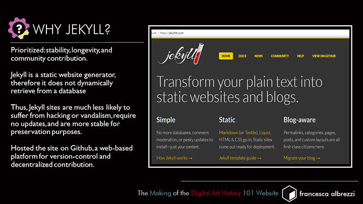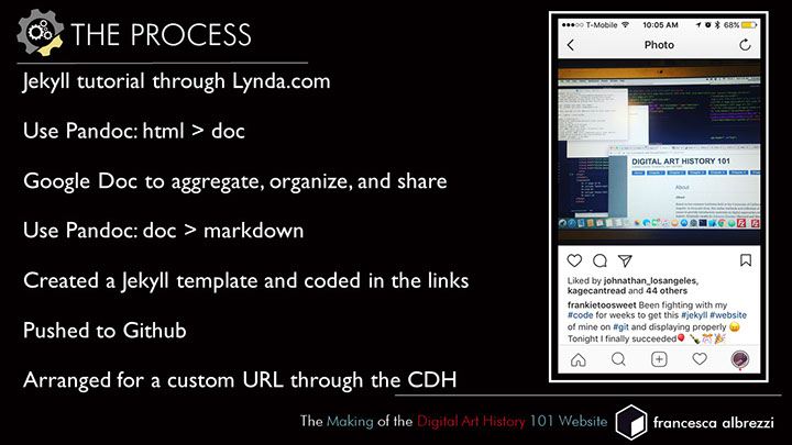 I collaboratively developed an online textbook entitled Digital Art History 101: A Basic Guide to Digital Art History that was a summary of resources reflecting the programmatic participation, various collaborations, and colloquium events that occurred during the course of the institutes, as well as additional research. The online resources is designed to introduce the fields of digital humanities and digital art history and provide an orientation to topics like data, visualization, space, 3D, and pedagogy. I also built the environment using Jekyll, an open source content management system (CMS) for building static web pages that are less vulnerable to hacking than other CMS’s, which I taught myself, along with Github, in order to push my code to an open repository where it could be added to and updated over time.